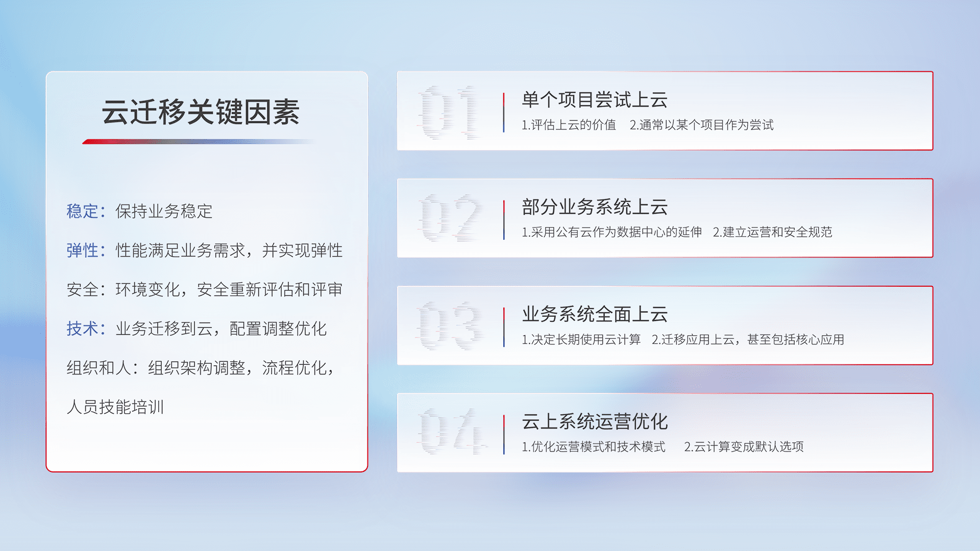结合实际业务,,从规划设计、、、、云平台选型、、云原生改造、、数据迁移、、、、集成交付,,,迁移全过程为客户识别最佳上云路径,,,,做好风险识别管理,,,,设计网络架构、、、身份权限、、安全审计合规、、、、操作审计、、日志审计、、、、监控告警策略、、、多站点容灾设计等,,,对云上基础设施进行整体规划,,提升IT治理水平,,,,以满足弹性、、、高可用、、、、高性能的需求。。