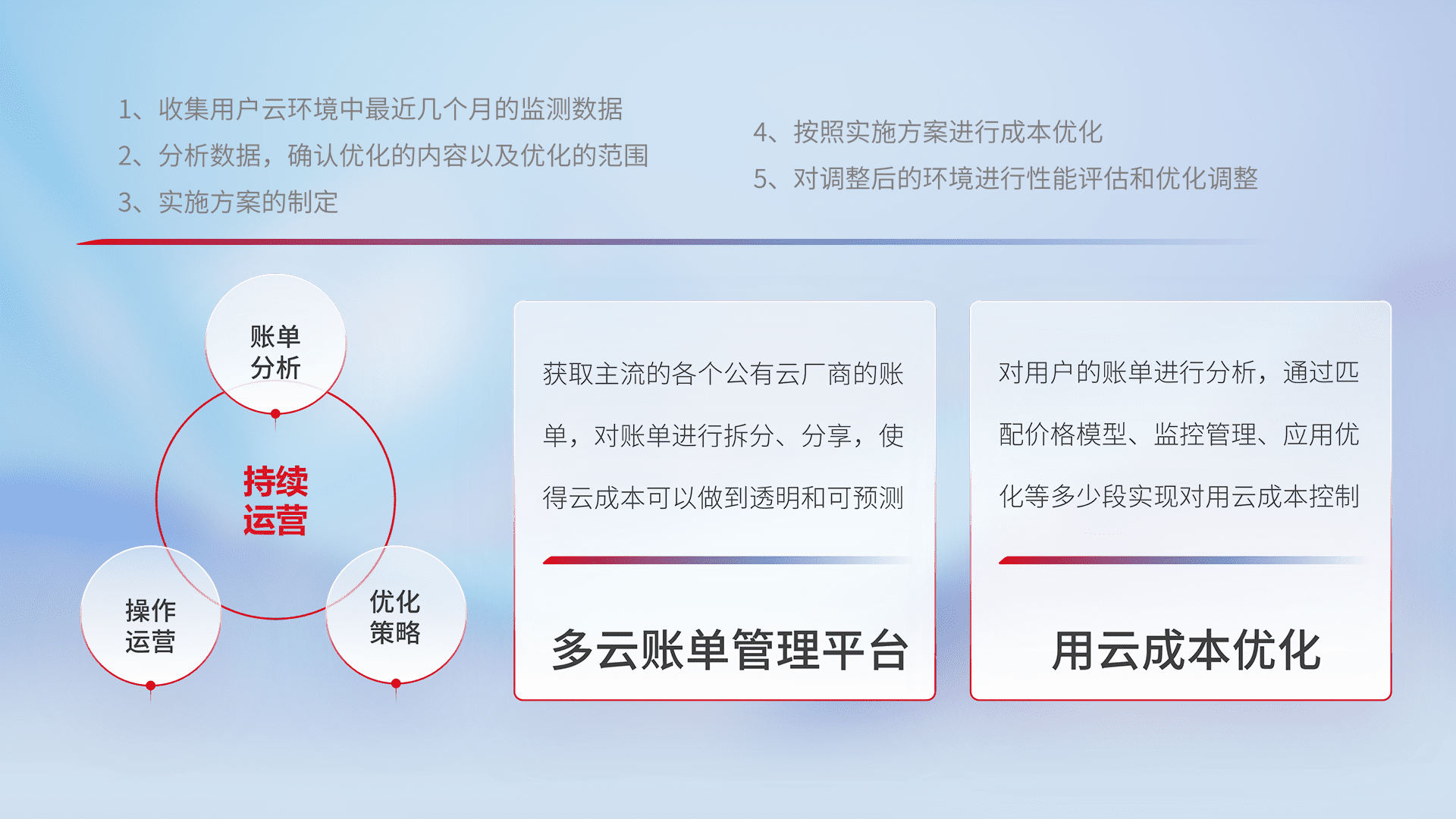 通过多云纳管,,以统一的资源数据模型把客户的云资源进行抽象和封装,,,,进而实现对多云资源的统一操作,,,保障云资源管理的可靠性、、稳定性与可用性。。。量身定制化运维内容,,,,配置、、、、开发运维、、、补丁管理、、备份、、监控、、、认证和访问管理、、、、审计和日常巡检等,,,保障在用云过程中的可靠度,,,,稳定度以及高可用率。。。